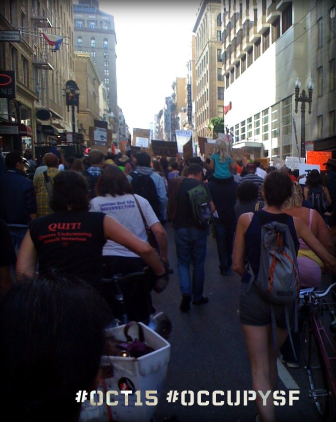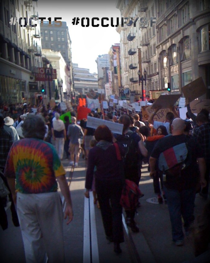 When the speakers were done, the crowd turned and began to march back up Market. We were a massed whole, chants going up. Everything from “whose streets? Our streets!” to the more overtly political “banks got bailed out; we got sold out!”. In the interest of full disclosure, I am not a chanter. I’ve never been one for public displays of much of anything, and chanting “what do we want? Tax the rich!”* while I wore my interview dress seemed a little weird. I do think we should tax the rich, sure, but I think it’s a very simplistic solution. And yes, that is called overthinking, but so it goes.