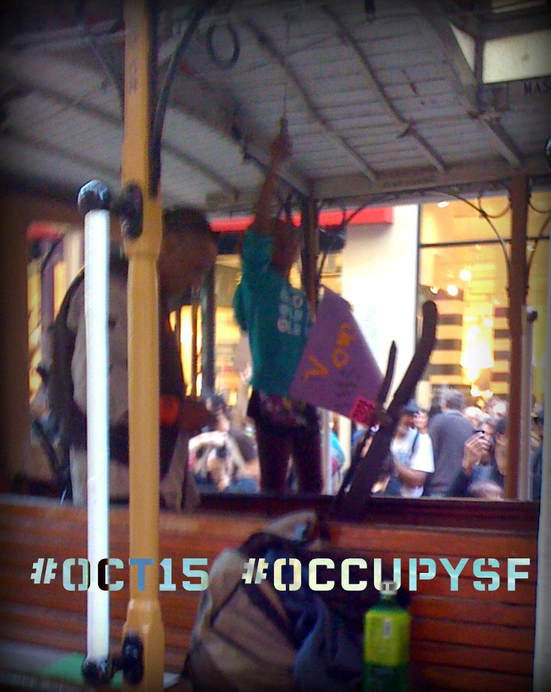As we marched to Civic Center Plaza, the operator of a street car stuck because of the crowd began ringing his bell in time with the chants. The crowd went wild, the operator gleefully keeping time. After a little while, a girl, maybe about five years old, was handed up to sit by him, and he showed her how to ring the bell, teaching her the rhythm.